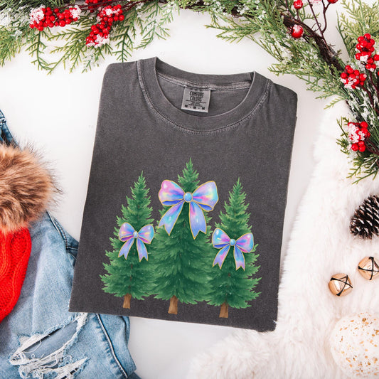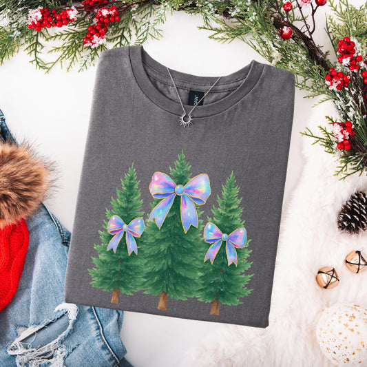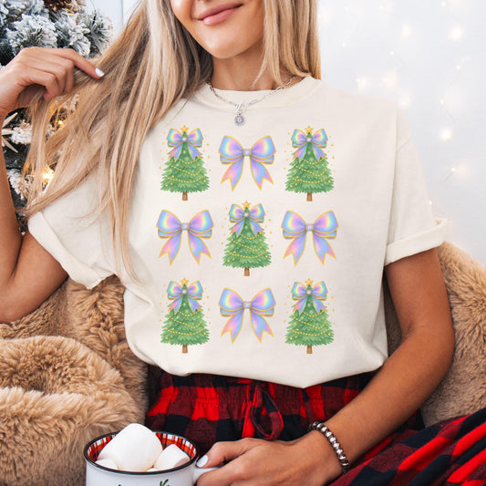 Coquette Bow Christmas Comfort Colors Shirt, Iridescent Christmas Tree T-Shirt, Xmas Gift for Her, Matching Family Holiday Tees, Cute Shirts