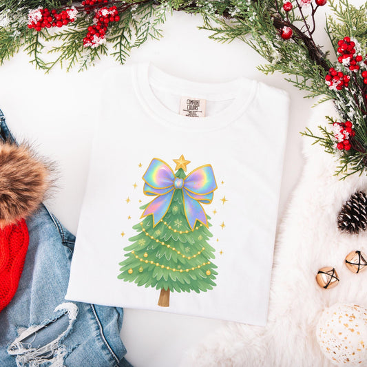 Coquette Bow Christmas Comfort Colors Shirt, Iridescent Christmas Tree T-Shirt, Xmas Gift for Her, Matching Family Holiday Tees, Girly Tee