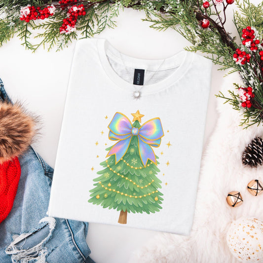 Coquette Bow Christmas Shirt, Iridescent Christmas Tree T-Shirt, Xmas Gift for Her, Matching Family Holiday Tees, Trendy Christmas Shirts