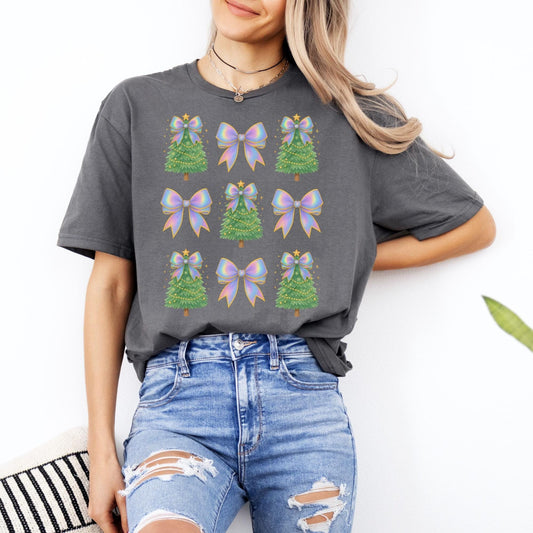 Coquette Bow Christmas Shirt, Iridescent Christmas Tree T-Shirt, Xmas Gift for Her, Matching Family Holiday Tees, Trendy Christmas Shirts